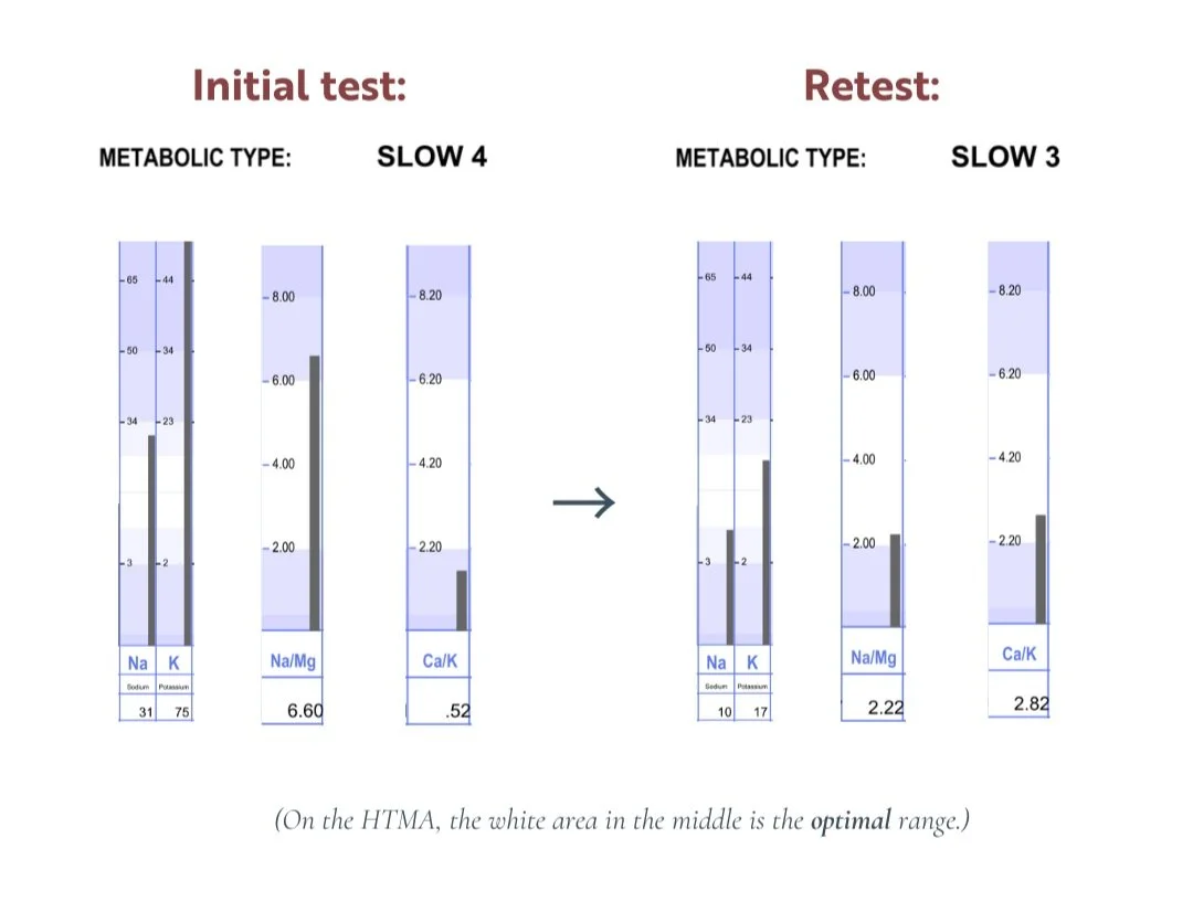 Based on her HTMA results, we then added supplemental stress-handling support like adaptogen herbs + specific minerals for her adrenals.