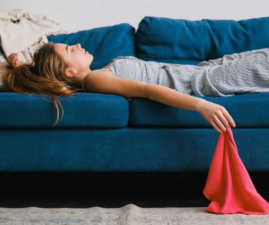 But if you can’t sleep more, you can rest in other ways. Some examples of rest: Time spent laying horizontal- especially with your legs up the wall or on a chair or couch- is deeply restorative. Meditation or breathing exercises can help switch your body into a rested state. Saying no to things is also a form of rest- like skipping the gym or cancelling plans so you can relax at home.